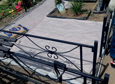 Подготовленную почву застелили геотекстилем, который будет препятствовать проростанию сорной травы в плиточных швах. В это же время на территории могилы были дополнительно установлены лавочка и столик.